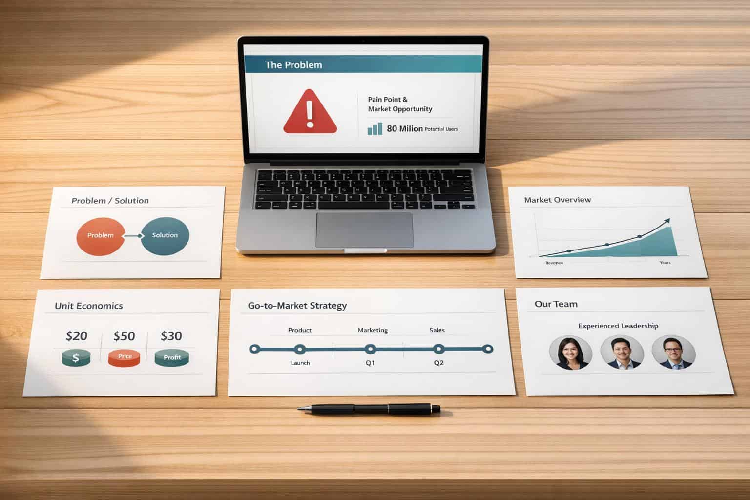 The best way to structure a pitch deck is to follow an order that tells a clear story while addressing what investors want to see. A common setup includes these slides: