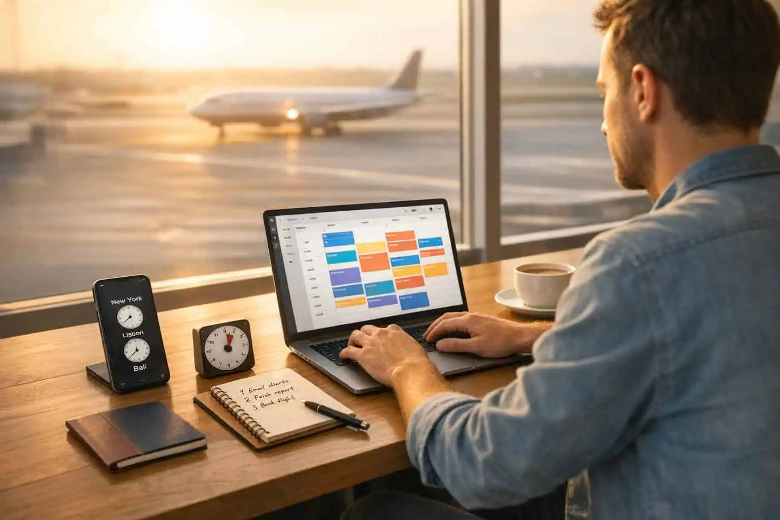 Batch tasks based on your environment. For example, reserve quiet mornings in your accommodation for high-focus work, and use transit time – whether on a plane, train, or bus – for simpler tasks like organizing emails or brainstorming.